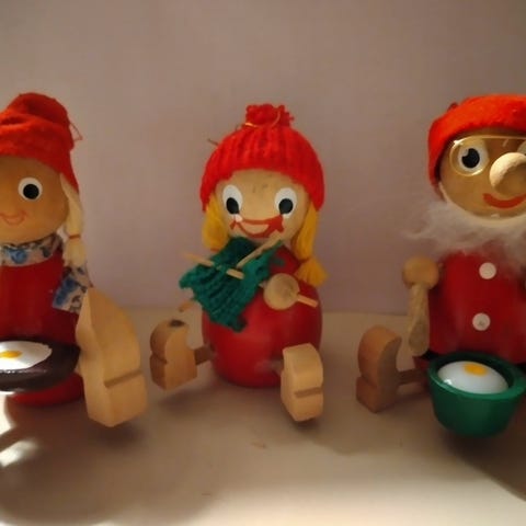 Træ nisser, 3 stk ældre træ nisser, 2 i slæder og 1 i gyngestol har lidt patina efter alder. Måler op til 10 cm. i højden og 9 cm. I længden. Sender gerne men køber betaler selv for en eventuel forsendelse.