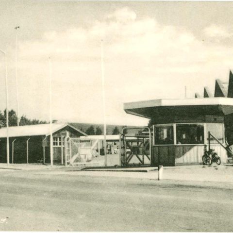 Ubrugt postkort fra 1960'erne med Danfoss ved Nordborg. Kortet viser indgangsporten i Elsmark med A-bygningen bagved.