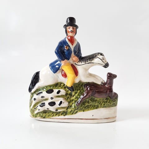 Antik, engelsk Staffordshire figur fra midten af 1800-tallet. Figuren forestiller en stående mand og kvinde iført traditionelle, smukke klæder. Der er tale om en ganske stor figur, der måler 25 cm i højden og 18 i bredden. Dybde 6 cm. Den er I perfekt stand uden skader. Står på Mols men kan gratis leveres I Aarhus og Ebeltoft eller sendes billigt på købers regning