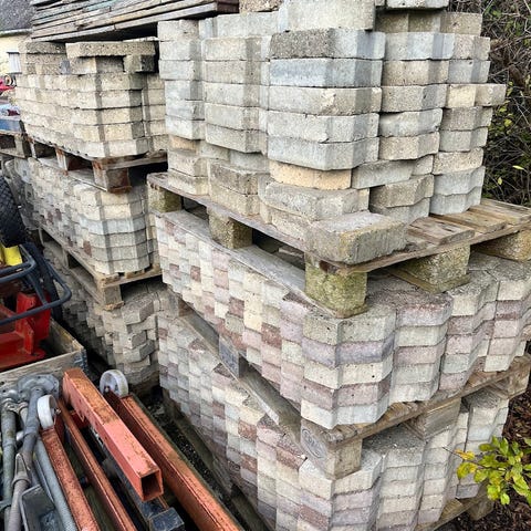 Sælger flere paller med røde SF-sten. Nogle er ubrugte. Nogle er pillet op og stablet. Skal nok stables om ved afhentning, da pallerne, de står på, er møre. Sælges billigt. Giv et bud.