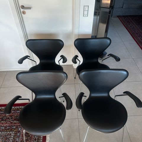 Som nye - Arne Jacobsen “syveren” med armlæn model 3207 i sort semi anilin læder.