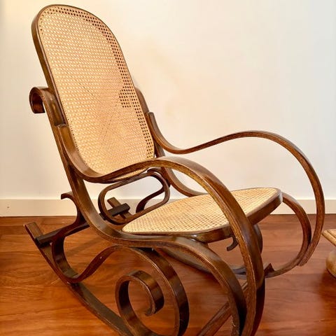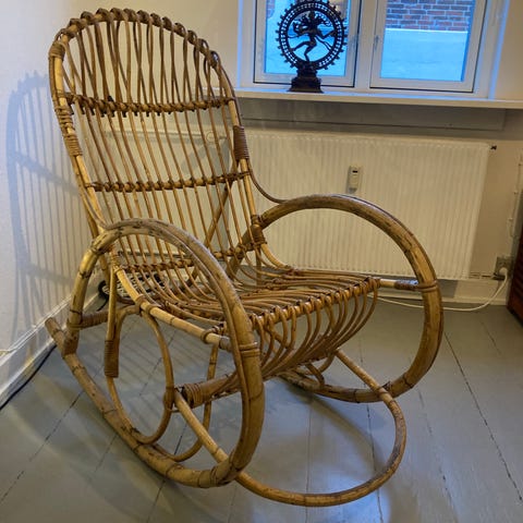 Spændende Gyndestol - designet af Luigi Crassevig --- elegance og siddekomfort er her gået op i en højere enhed --- stolens alder kender jeg ikke men er netop blevet professionelt restaureret , med nyt flet - alt træ afslebet og lakeret -- stolen er i super stand . Gyngestolen ses tit på internationale auktioner .