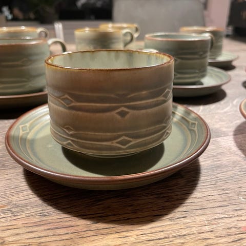 4 kopper med underkopper og sidetallerken 100 kr pr sæt
