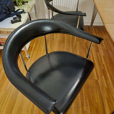 Fasem har i mange år været eksperter i at sy kernelæder. Dette kommer til udtryk i deres klassiske stol som er verdenskendt. P40 stolen er komfortabel, robust og med sine armlæn perfekt til lange samtaler ved spisebordet eller mødebordet. Kernelæder er sort indfarvet. Stellet er i krom.