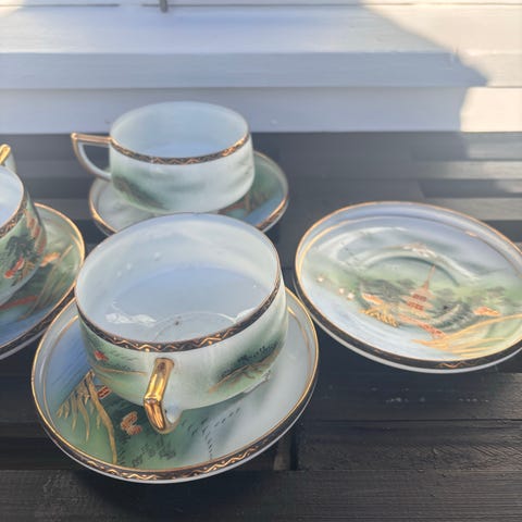Mini stel i blå med blomster, og fine gulddetaljer.