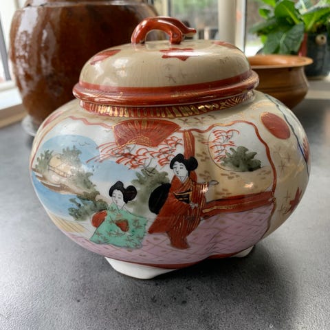 1) Kun-it betel krukke/beholder, ”skål i skål” og med to indsatser ”skål i skål”. Beholderen har en diameter 16 cm, højde 14 cm og kan omsluttes af den udvendige store skål samt rumme de to indvendige skåle.