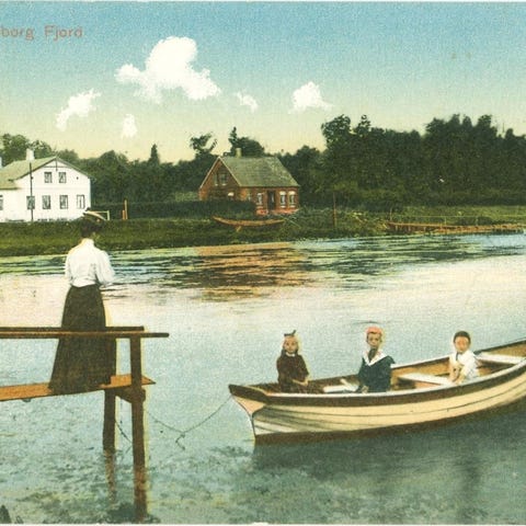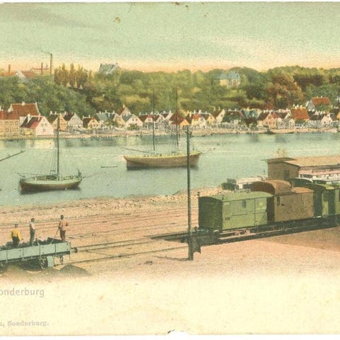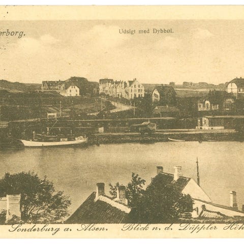Coloreret postkort i bedste kvalitet stemplet Sonderburg 16.6.1908. Fra Sønder Havnegade i Sønderborg. Til højre ses ”Hotel Danmark”, der var ejet af H.H. Bartram. Foto fra ca. 1900.