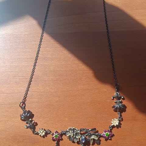 Halskæde med Safir fra Carré smykker lavet i oxideret sterling sølv, der gør overfladen næsten sort, og er sat med facetslebne Safir ædelsten i forskellige farver.