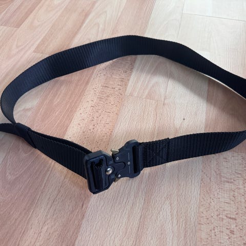 Sort bælte med blankt spænde fra Bæltekompagniet, kvaliteten er kunststof, længde 80 cm, pænt og velholdt.