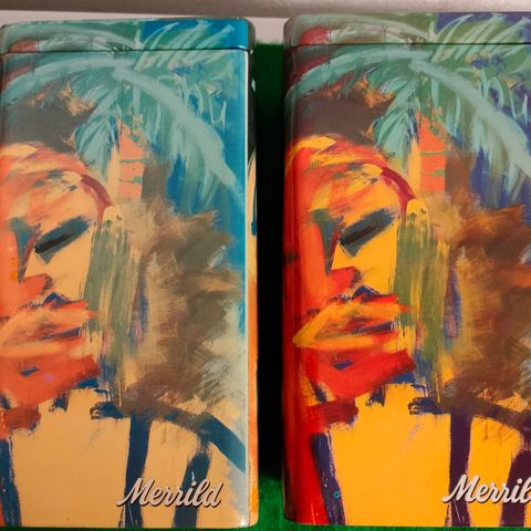 Flot kaffedåse fra Merrild kaffe med kunstnerisk motiv. Er i god stand med lidt patina. Mål: 21x12x9 cm