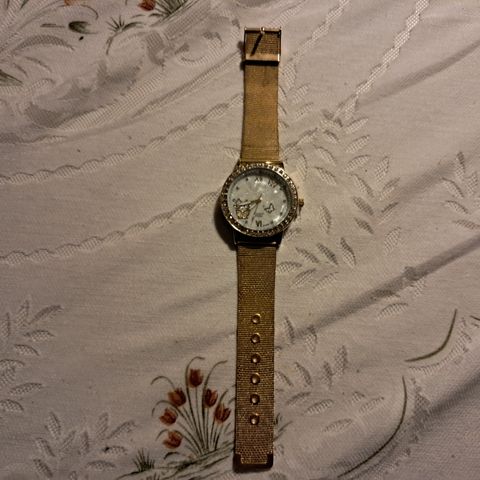 Elegant og klassisk dameur med guldfarvet urskive og sølvfarvet metalrem. Uret er af mærket Quartz og har et enkelt, tidløst design. Det sælges uden batteri og er derfor ikke testet, men ser ellers fint ud kosmetisk med almindelige brugsspor.