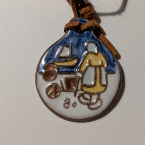Vedhæng, andet materiale, Skønt keramikvedhæng fra Michael Andersen Bornholm. Lædersnoren trænger til udskiftning. Vedhænget måler 4 cm i diameter.