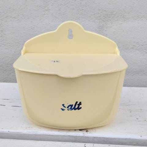 Rød/orange væghængt saltkar med hvidt låg fra Rosti - det gamle logo med nr. S25. Saltkarret der måler 15 cm i længden og er 14,5 cm højt. Har som det ses på et af billederne et par mikro-nag i kanten, men er ellers efter alderen i pæn velbevaret stand.