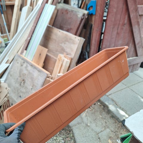 2. Sød altankasse med lille mønster. Italiensk terracotta. Længde 35 cm. Højde 12 cm og Dybde 15,5 cm. Der er en revne i bunden men den er ikke gennemgående.