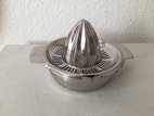 Flot robust citruspresser i stål/metal. Nem og praktisk at bruge med greb og hældetud. Højde 10 cm, diameter 12 cm + greb.