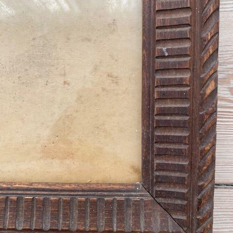 Fed gammel retro vintage træ billedramme, Fed gammel charmerende retro/vintage træ billedramme med patina aldersspor som den står på billede, rammens størrelse bredde ca 37,5cm højde ca 48cm. Sender MOD betaling af porto, sendt med GLS som pakke UDEN omdeling 54kr.