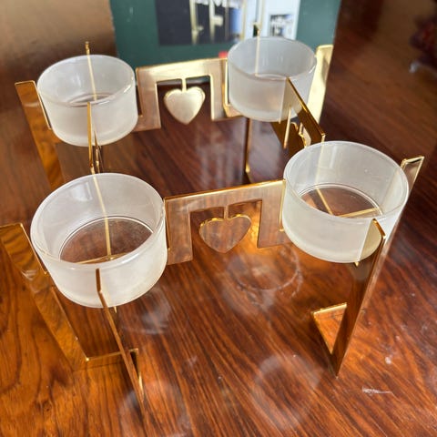Adventsstage Holmegaard, Rigtig fin adventsstage fra Holmegaard. "Guld" farvet. Mulighed for at isætte 2 forskellige stager til henholdsvis almindelige lys og fyrfadslys. Har været brugt og har derfor et par steder nogle bitte små "skrammer". Alle glas stagerne er hele og uden skår, dog har et af fyrfads stagerne et sted hvor "sandblæsningen" mangler. Se billeder.