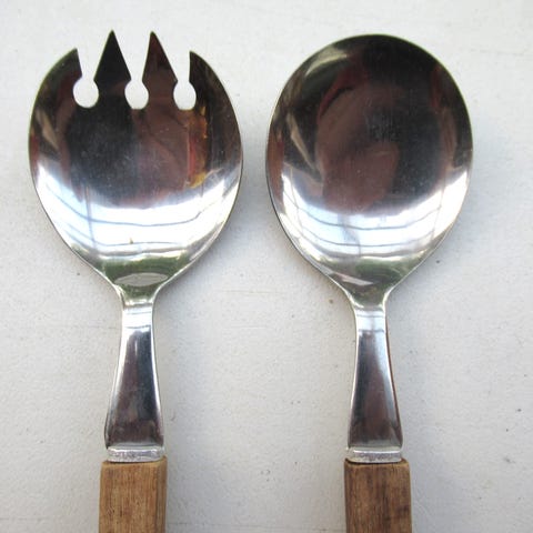 Fint salatbestik købt omkring 1960 i træ og med flot porcelænsskaft og 27 cm lang.