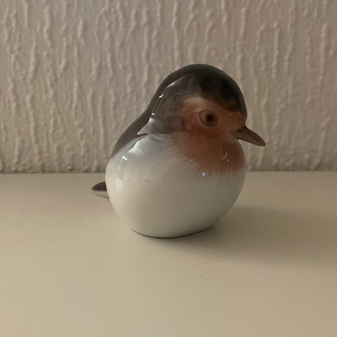 Fugl, , finke, spurv, musselmalet, Royal Copenhagen, Royal Copenhagen har gennem tiderne valgt nogle dyr, i stedet for at male dem i de farver, de fremstår i i naturen, at lade dem være hvide og herefter bemale dem med musselmaling. Nogle i purpur, men oftest i den blå musselfarve.