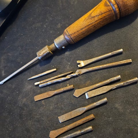 Lot med gamle forskellige skruetrækkere i for skellige størrelser og kærv.