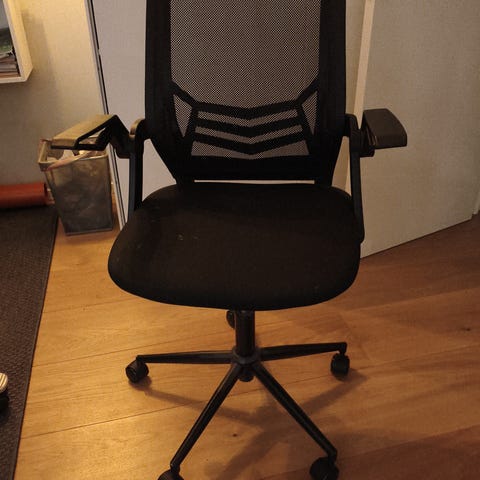 Kontor stol uden armlæn, med sort polster. Funktionel med flere indstillingsmuligheder .
