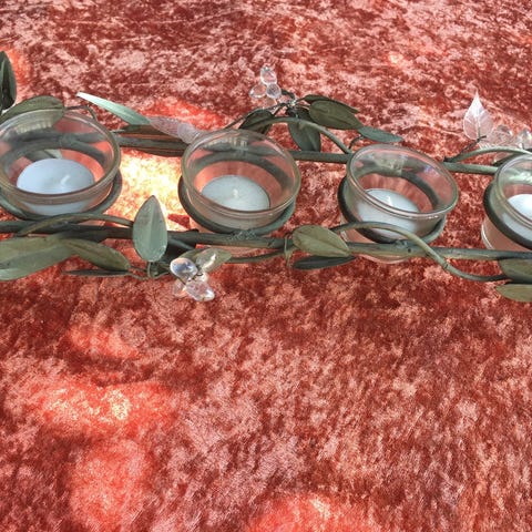 ca. 15 cm høj fyrfadsstage dekoreret med perler. Forestiller et par i grønlandske nationaldragter på den ene side, en kvinde i nationaldragt på den anden side.