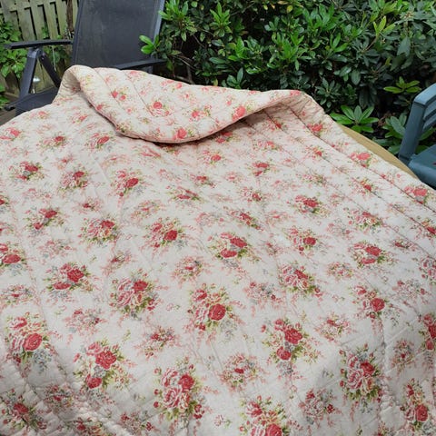 Sengetæppe, Så smukt vintage vattæppe med de skønneste roser. Tæppet har et lille hul, som ses på sidste billede. Fra røgfrit hjem. ( Sender ikke )