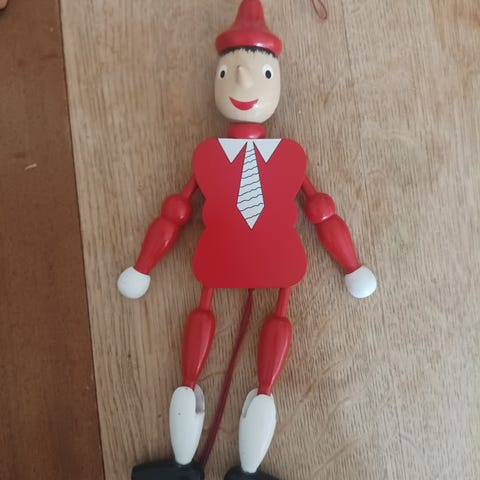 Pinocchio til ophæng på gren/ juletræ mm. L: 12 cm og L med lædersnor ca. 19 cm.