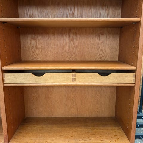 sælges til Boligens Byggeskabe (reol, dybde 34 cm) designet af Grethe Meyer og Børge Mogensen.