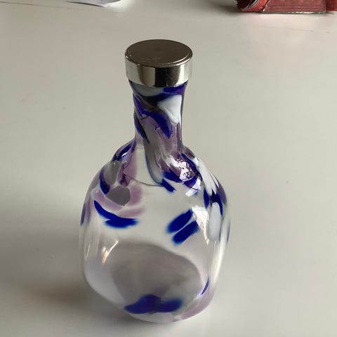 Blå karaffel 20 cm med 6 snapseglas 9 cm mundblæst.