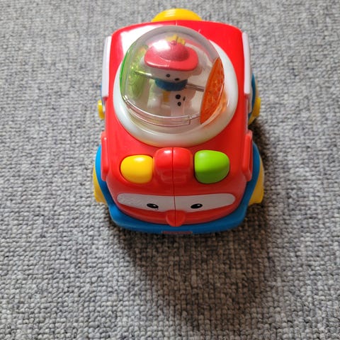 Farverig Fischerprice tromle bil med små kugler inde i tromlen.