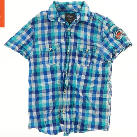 Skjorte, blå med tekst både foran, bagpå og på ærme, mrk. L.O.G.G., str. 134, 2 brystlommer, kr. 25,00.