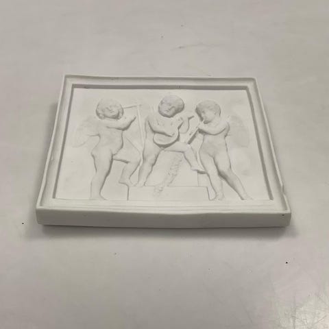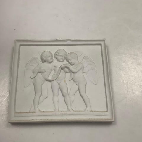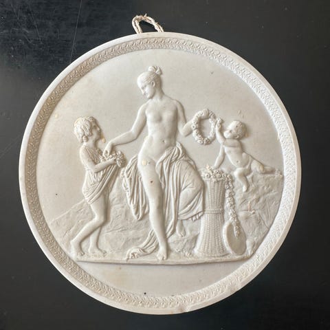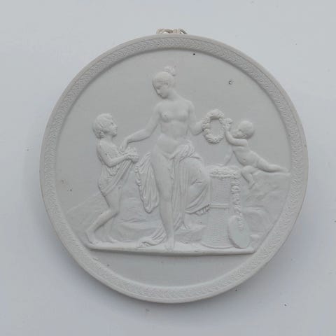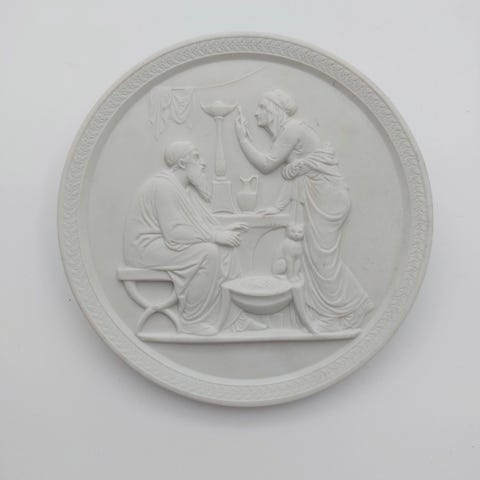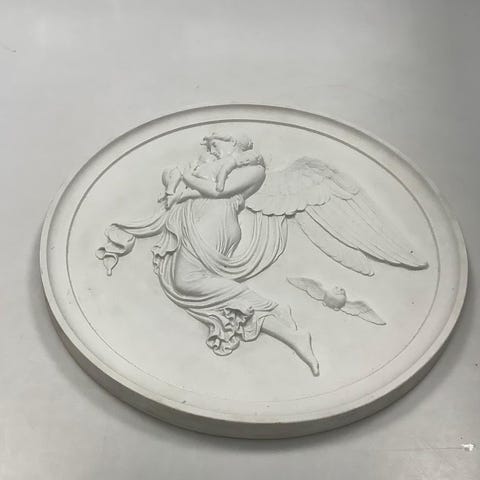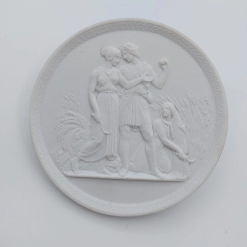 Bertel Thorvaldsen: Royal Copenhagen bisquit platte "Alderdom og vinter" og “Manddom og efterår” efter relief modelleret i Rom 1836. Måler ca. 14.5cm (5.70 inch).