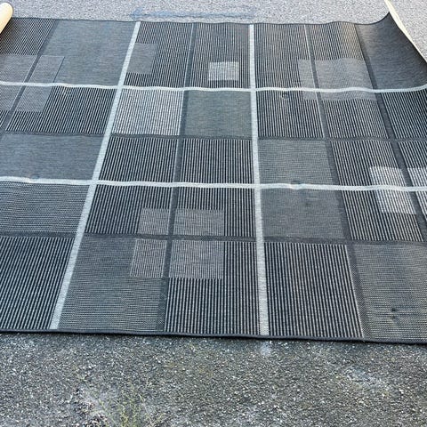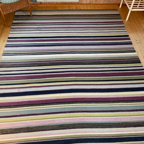 Tæppet er i god stand - fremstår pænt og rent. Brune pletter bagpå, går jeg ud fra er tekstillim til at lime bagstykket på. Tæppet har lidt farveforskelle i de grønne områder, det er uld, så et levende materiale der udvikler sig over tid.