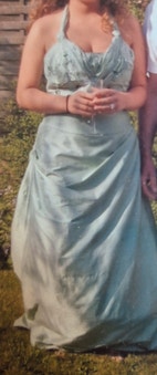 Smuk grøn gallakjole i 100% silke, italiensk design. Todelt med skørt med ekstra længde og corsage overdel med halterneck. Der står størrelse 48, da det er italiensk størrelse gætter jeg på at det svarer til str. 44. Men kan nok passes af 42-46, da corsage jo giver mulighed for tilpasning.