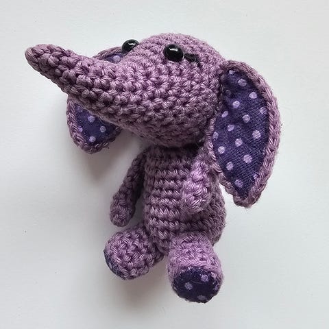 Hæklet, orange elefant fra "För Änglabarn". Elefanten måler 17 x 13 cm.