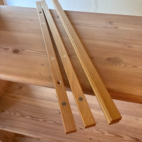 De tre sæt har hver en under og en overdel (i alt 4 lister med magnet per sæt). Måler 51 cm. Fyrretræ med et lille brændemærket M. Sælges samlet.