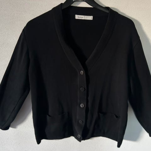 Cardigan i friske farver, der kan bruges året rundt. Den er str. L - jeg synes det dækker over str. 40-42. Smukke mønstre er indvævet. Swarovski sten i lynlåsen. Den måler ca. 52 cm fra ærmegab til ærmegab liggende fladt.