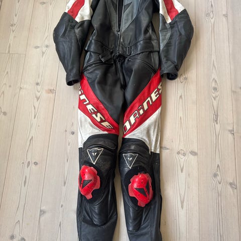 Dainese 2 delt læderdragt str 50, brugt af kvinde 160 cm høj, lækker kvalitet, i 80er style. Der følger regndragt med i superkvalitet, samt overtrækshandsker og overtræksstøvler.