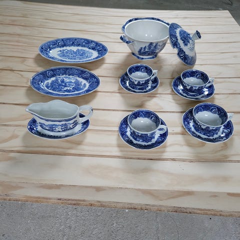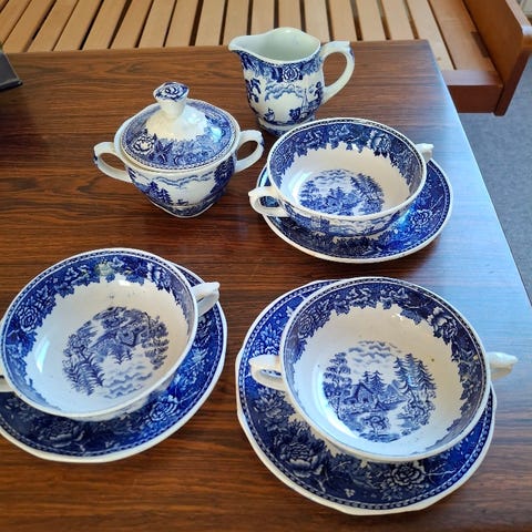 Arabia i Finland lavede dette smukke stel Blåt Landskab fra 1955 til 1970. Saucekande uden skår. Læs og se priser her: https://www.lavitrinedecaroline.nl/en_GB/c-4567389/arabia-landscape-blue/