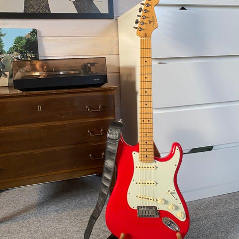 Der er slidmærker på gribebrættet og vibratorarmen er ikke original, men ellers er guitaren Fenders topmodel i perioden 1998 - 2004 .