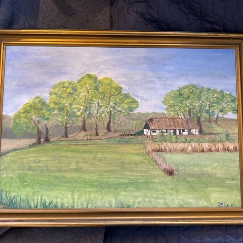Oliemaleri, Susanne Munk Birck, motiv: Landskab, stil: Modernisme, b: 42 h: 34, ‘Morgen ved Monemvasia’ maleri 42X34 af kunstmaler Susanne Munck Birck (afdød).