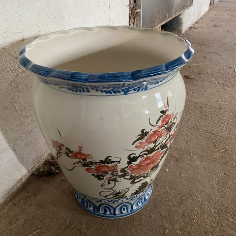 Fransk udseende i rødt lertøj, har stået inde. Har kun et meget lille afslag som ikke er nyt og derfor næsten ikke ses.