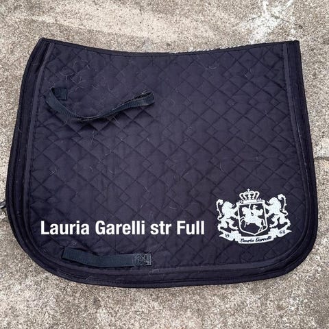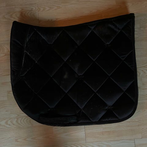 Flot mørkeblåt underlag med satin look og guldkant. Lille pude foran så det ikke glider tilbage under sadlen