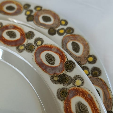 Nucella fajance produceret 1966-1970. Design Ellen Malmer. Flere dele er 2. sortering, men uden fejl. Det er farverne i dokorationen, der kan variere lidt - en charme mere. 6 Sæt med kop, underkop og sidetallerken pr stk 125,- Kop Ø 8 cm H: 6 cm. Underkop: Ø: 14.5 cm. Sidetallerken Ø: 20 cm. Spisetallerken: 9 stk a 85,- Ø: 24 cm. Desserttallerken 10 stk a 75,- Ø: 18 5 cm.