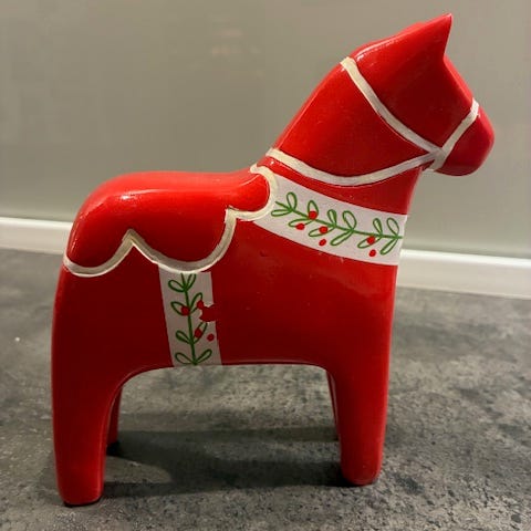 Rød hest med mønster, Fin hest men en smule patina se billeder. Måler 22 cm. på højeste sted og bredde målt på bredeste sted 22 cm. Sender gerne men køber betaler selv for en eventuel forsendelse.
