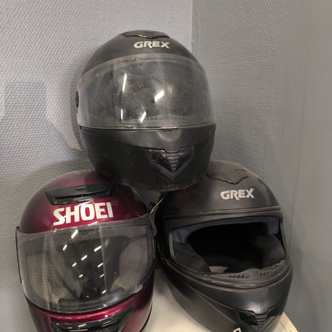 Hjelme, 4 Forskellige Full Face Styrthjelme med diverse finesser, fra 150 - 400 Pr. Stk / Vi har 3 gode hjelme fra Medium til XXL / FRa venstre er det en Medium, XL; XXL & Medium Str 57/58