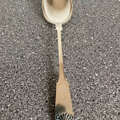 Potageske fra 1921 i fransk lilje mønster lavet i sølv af N.Olsen. Den måler 28,5 cm i længde,har inskription på bagsiden med et monogram og1921.