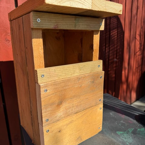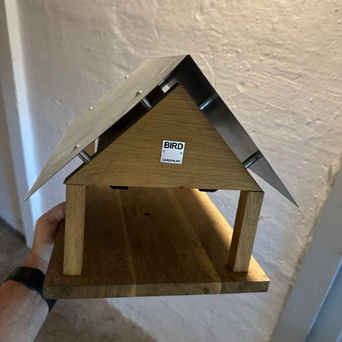 Ny fuglehus til Musvit. I hårdt træ med kobbertag og rensebund.