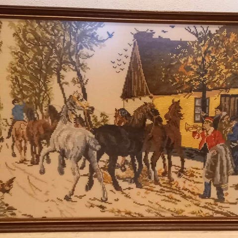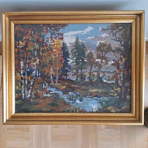 Broderet landskabsbillede, Flot charmerende landsbybillede i korssting med titlen
